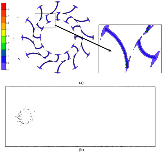 where V is the cell volume (in m3) and |U| is the local flow velocity magnitude (in m/s). The lower limit of Δt, which can capture all of the flow domain, is recommended for LES; however, higher Δt can be used. Figure 5 depicts the spatial distribution of Δt within the flow domain. In Figure 5a, the lower limit is set to 0.005747 s, which is equivalent to 1° rotation of the rotor, while in Figure 5b, the lower limit is set to 0.5° rotation. It can be seen that most of the flow domain (except upstream stator and rotor zones) can be reasonably captured using a Δt of 1° per time step. The temporal resolution can be further improved by considering 0.5° per time step. Obviously, there is trade-off between better temporal resolution and computational resources available/required; we have considered 1° rotation of the rotor blades per time step in the present study.