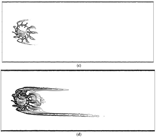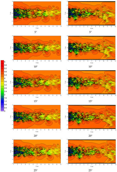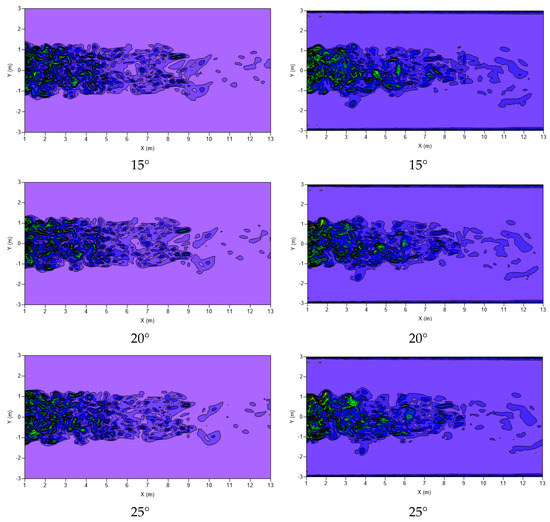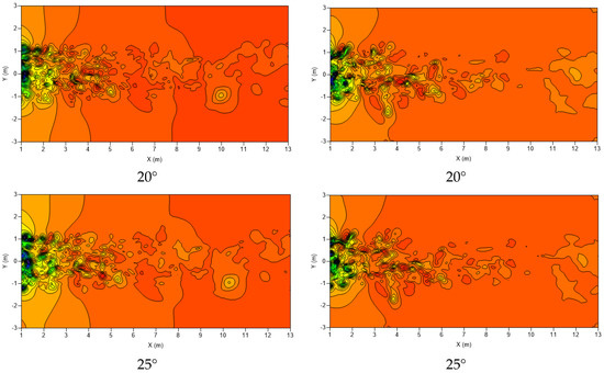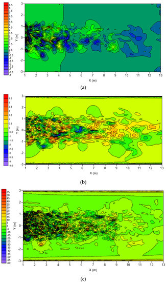 In Equation (2), lo/Δ is the ratio of integral length scale to the number of elements and is used to analyse cumulative k against the length-scale of eddies based on Kolmogorov’s energy spectrum. ε is the dissipation rate of k (in m2/s3) and V is the cell volume (in m3). lo/Δ ≥ 1.25 ensures that ≥50% of k is resolved, ≥4.8 ensures ≥80% resolution, and ≥12.5 ensures ≥90% resolution. Figure 4b depicts the spatial distribution of lo/Δ on plane Z = 0 for lo/Δ ≥ 1.25. The regions that are not covered by contour plots represent k resolution of ≥50%. It can be observed that k has been resolved reasonably well in the flow domain. For reference, we also present the spatial distributions of lo/Δ ≥4.8 and ≥12.5 in Figure 4c,d. It can be observed that most of the wake region has a k resolution of ≥80%. Thus, it can be concluded that the mesh quality in the flow domain is reasonably accurate to carry out LES.