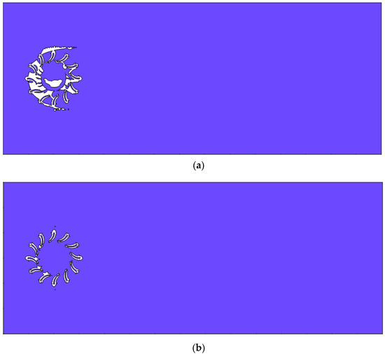 The vorticity distribution shown in Figure 10 provide similar insights about the wake regions of healthy and damaged VAWT models, with some visual differences between the two. The vortices in case of the damaged VAWT seems to be stronger than the healthy VAWT (based on the scale) and extend further downstream in the wake. As previously, without breaking the resultant flow fields into individual components, accurate quantification of the wake dynamics is very difficult. This is of particular interest in the present context for the recognition of distinct patterns in the wake flow fields. It is envisaged that this study will provide a functional basis for the development of better flow control mechanisms and machine learning algorithms. For reader’s interest, we provide the time-averaged spatial distribution of pressure, velocity, and vorticity fields of both the healthy and damaged VAWTs in Appendix A.