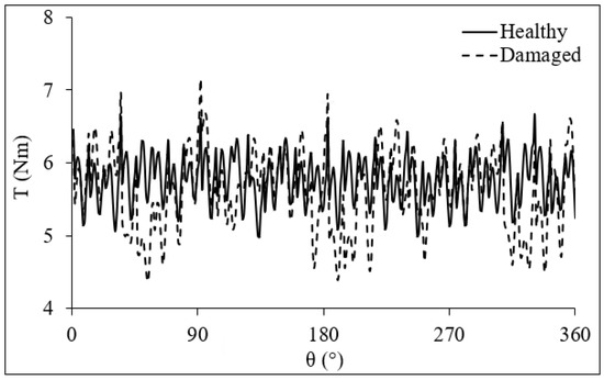 where CT is the torque coefficient of the VAWT, A is the swept area of the VAWT (in m2), R is the rotor radius (in m), ρ is the density of air (in kg/m3), and U is the incident flow velocity on the blades (in m/s). Torque signals for one full revolution of healthy and damaged VAWTs have been plotted in Figure 6. It can be seen that (as in many published studies as well) the amplitude of torque signal from the damaged VAWT seems to be higher than the healthy VAWT. The −ve peaks in case of damaged VAWTs depict significantly lower torque values compared with healthy VAWT; thus, it is expected that the average torque output from the damaged VAWT will be lower than the healthy VAWT. In order to ensure this, basic statistical analyses were performed on both the torque signals. The results are summarized in Table 1. As expected, the average torque output from the damaged VAWT is 2.52% lower than the healthy VAWT, while its amplitude is 66.52% higher. This indicates that the damaged VAWT experiences significantly higher wind loads, which can have a considerable impact on its structural health. In published literature [8,9,10], researchers have extensively used digital signal processing techniques to find out the dominant frequencies in the torque signals and have attempted to link them to the damage the VAWT has experienced.