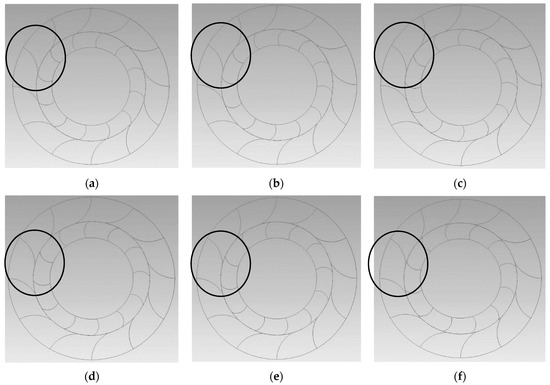 Positions of rotor blades w.r.t. stator blades: (a) 0° (in-line; same as 30°), (b) 5°, (c) 10°, (d) 15°, (e) 20°, (f) 25°.