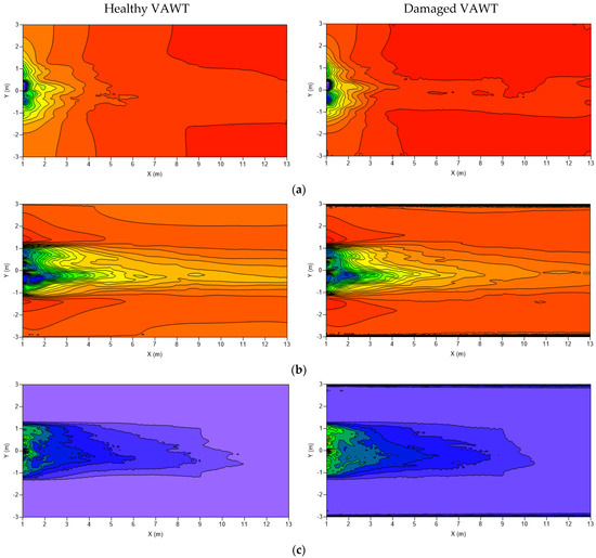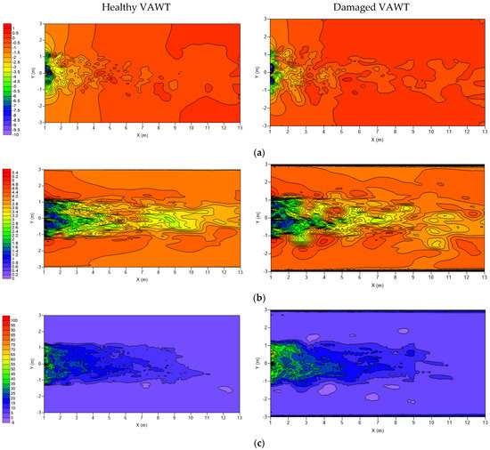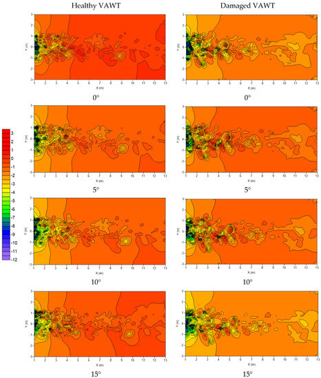 Before moving towards breakdown of the flow fields into their individual components, another statistical technique that has recently been used for flow field comparisons in some studies [35,36,37,38] is discussed here. The difference between the flow fields of healthy and damaged VAWTs, for the same flow parameter, can be computed as