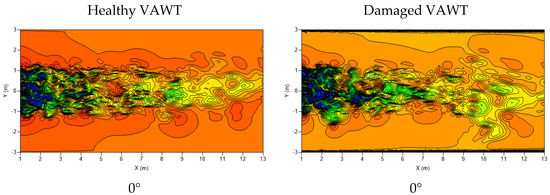 Spatial distribution of flow velocity magnitude (in m/s) in the wake region of healthy and damaged VAWTs.
