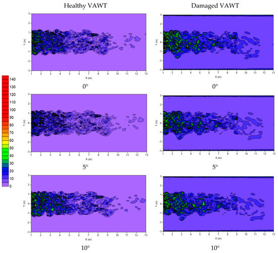Spatial distribution of vorticity magnitude (in %) in the wake region of healthy and damaged VAWTs.