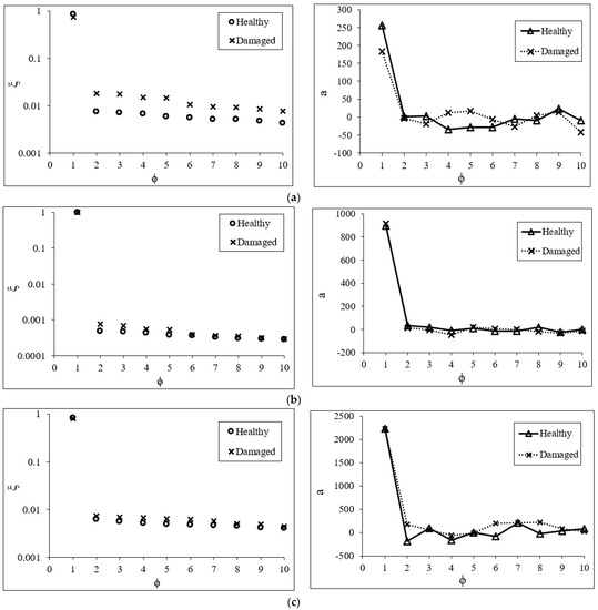 Spatial distribution of ξ and a for ϕ1 … ϕ10 in the wake of healthy and damaged VAWT, based on (a) pressure, (b) velocity, and (c) vorticity data.