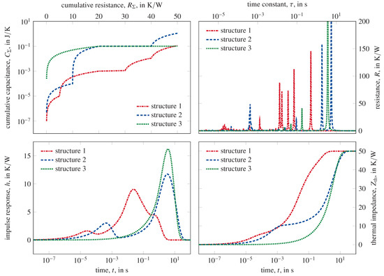 The thermal resistances, , and capacitances, , in Table 1 are chosen to be roughly similar to real electronic devices of varying complexity. While the time constant spectrum of structure 3 consists essentially of a single peak and has only three sections, structure 1 includes many smaller and larger peaks resulting from five sections. An illustration of the corresponding structure functions as well as the time constant spectra, impulse responses, and thermal impedances is given in Figure 3.