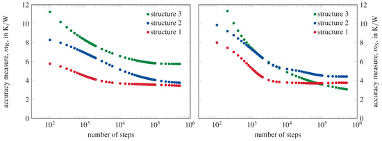 In all tested examples, convergence is achieved much later than discussed in the literature, which suggests the use of about 1000 steps [13,23]. However, according to the results depicted in Figure 4 it seems appropriate to use up to iteration steps and more.