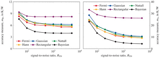 For Fermi and Gaussian filters, it is more difficult to find a good value for the filter configuration as these filters depend on two parameters. This is a significant disadvantage for Fermi and Gaussian filters, because the optimum filter has to be searched in a two-dimensional parameter space. In contrast, the Nuttall, Hann, and rectangular filters depend on one parameter only. To determine suitable filter configurations, a linear search as in Figure 5 is performed. This procedure must be repeated for each of the three test structures and both accuracy measures, and , all tested filters, namely the Fermi, Gaussian, Nuttall, Hann, and rectangular filters and different signal-to-noise ratios.