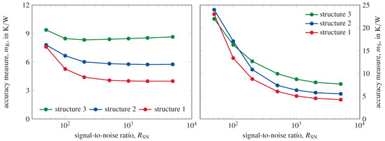 Measuring the accuracy of structure functions via (25) means that the absolute accuracy of the total thermal resistance is not reflected in . The upper integration limit is defined by the point of the divergence via (26). Only the shape of the divergence is taken into account and not its relative position. For these reasons, an additional measure of accuracy is used to characterize the total resistance belonging to the recovered structure function. The difference in total resistance, , is calculated by comparing the theoretically expected resistance to as defined in (26),