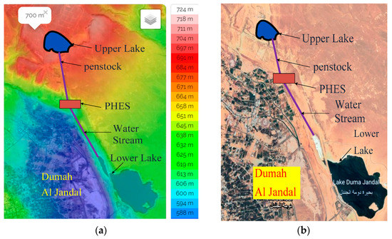 The proposed HRES in Dumah AlJandal site. (a): Topological view [33]. Reproduced from [33], Topographic maps: 2021. (b): GOOGLE EARTH view.