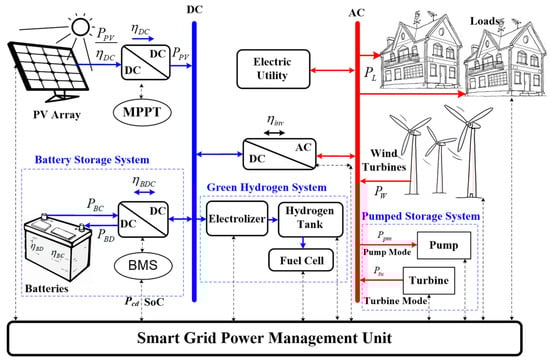 - Awan, A.B.; Zubair, M.; Sidhu, G.A.S.; Bhatti, A.R.; Abo-Khalil, A.G. Performance analysis of various hybrid renewable energy systems using battery, hydrogen, and pumped hydro-based storage units. Int. J. Energy Res. 2019, 43, 6296–6321. [Google Scholar] [CrossRef]