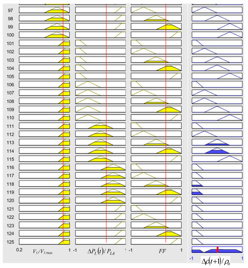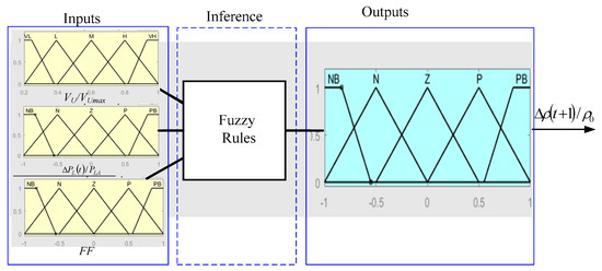 The concepts of the smart grid are applied to the proposed system by using a dynamic tariff that can share the responsibility of the HRES stability with the customers. The proposed demand response strategy introduced in this paper uses the resources available of the HRES to suggest a tariff. The factors that can affect the stability of the HRES are the volume of water in the upper lake (the lower lake is assumed to have enough water all the time), the power difference between the generation from the renewable resources and the load power, and the forecast factor that can measure the future situation of the HRES taking into consideration the future power available from the renewable energy sources based on the weather conditions and the future load power which can be obtained from Equation (18). All these factors should be fed to the fuzzy logic controller (FLC) [52] to determine the new tariff to preserve the stability of the HRES. The proposed DR strategy using the FLC is shown in Figure 5. The structure of the FLC used with the DR strategy is shown in Figure 6. The sample of membership functions that can represent the logic used in the design of the DR strategy is shown in Figure 7.