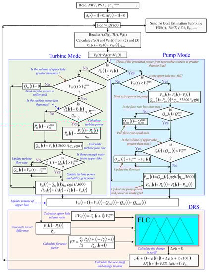 One more technology will reduce the size of the components of the HRES, especially the ESS, which is the demand response management (DRM) [1,12]. The use of DRM as one of the smart grid tools will allow the customers to participate in the stability of the HRES. This can be accomplished by using a dynamic tariff strategy to increase the tariff during periods of low electric generation availability from renewable resources to reduce the load and reduce the tariff when the generation from the renewable resources supply is higher than the load requirements. This strategy has been introduced using a new relationship between the state of charge (SoC) of the battery, the power difference between the generation and load, and the tariff based on the power elasticity demand [1]. Another study introduced a fuzzy controller to adapt the tariff changes based on the situation of the HRES and the previous responses of customers [12]. In this study, the fuzzy logic control (FLC) method will be used as a controller to dynamically and actively adapt the tariff based on the previous response from the customers. In the proposed strategy introduced in this paper, a fuzzy logic controller is used to actively adapt the tariff based on the water levels of the upper lake of the PHES, the power difference between the generation and load, and the forecast factor (FF) that considers the forecasted loads and weather conditions to predict the near future stability conditions of the HRES. This forecast factor uses the difference between the generated power from renewable energy resources and the forecasted loads for the coming several hours. The use of DRM through the use of the new proposed demand response strategy (DRS) introduced in this paper substantially reduces the size of HRES components without affecting the reliability of the system which can be translated into a substantial reduction in the cost of the generated energy.