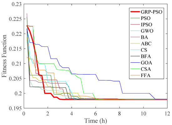 Sizing the HRES is a very important stage before starting the installation stage to determine the feasibility and reliability of the system. Most sizing strategies used different objective functions to be minimized; some of these objective functions are economical, technical, or environmentally-based. Some studies design the HRES for minimum cost as a single objective function [13,14,15,16,17,18,19] and some other studies (multi-objective optimization ones) use more than one objective function to size and design the HRES [20,21,22,23,24,25]. The use of multi-objective optimization permits better operation of the HRES concerning different techno-economic factors. The design step can be performed based on an average analysis or it can be based on the timely version where the whole year is taken as an operating interval and the HRES should be able to feed the complete loads during all the hours of the year [1,12]. The latter strategy can give more accurate results than the average one, but it will a long time in the optimization stage and it may make the convergence time of the optimization very long. Many studies have been done to reduce the convergence time of the optimization by comparing different optimization algorithms and recommending a fast and reliable one [23,24]. Some other strategies change the number of search agents to reduce the convergence time, but this may make the optimization converge at a premature solution [26]. The failure rate is a factor that represents the ratio of how many runs of the optimization algorithm failed to converge at the optimal solution to the total number of runs of the algorithm. The cross-relation between the convergence time and failure rate to choose the number of search agents is a hard job where the increase of the number of search agents reduces the false (premature) convergence, but it will increase the convergence time. On the other way, the reduction of the number of search agents of the optimization algorithm reduces the convergence time but it will increase the probability of premature or failed convergence. Some studies make a trade-off between the convergence time and premature convergence to select the optimal number of search agents (swarm size) [27,28,29,30]. This optimal number of search agents will not solve the problem completely but it will give a midway solution for this dilemma. This dilemma is solved completely in this study by using a modified PSO optimization algorithm called gradually reduced particles of particle swarm optimization (GRP-PSO) algorithm in which it will start with a high number of search agents and these agents are reduced gradually during the optimization steps by removing the worst solution in each iteration. This new proposed strategy reduced the convergence time substantially with very accurate results.