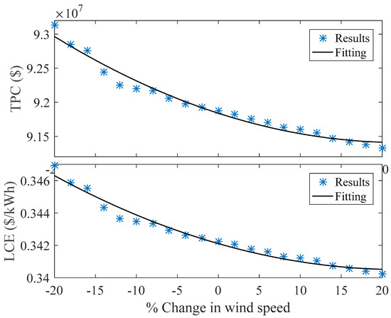 Two sensitivity analysis studies are introduced in this paper to predict the variation of the LCE on any change in wind speed or solar irradiances data used in the available data. With ±20% change in wind speed or solar irradiances, the variation of the TPC and the LCE never go beyond ±1.3% change which proves the proposed system is having low sensitivity with a substantial change in wind speed or solar irradiances.