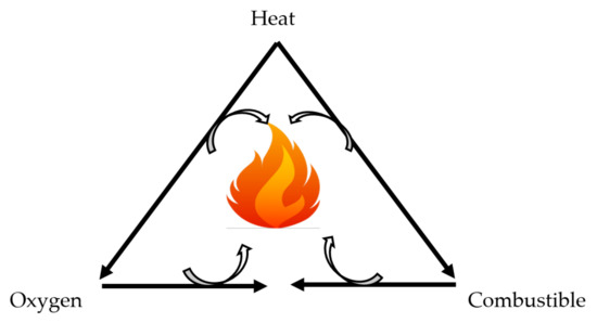 The volatile species consist of gases and vapours that can be either flammable (CO, CH4, low molecular weight organic compounds) or non-flammable (CO2, H2O, NH3) so that the process of the fire triangle is self-sustaining (as shown in Figure 2) [12,13]. It is essential that the composite material is supplied with sufficient heat to release the flammable pyrozylate gases, which then react with the atmospheric oxygen to produce H* and OH* radicals. These free reactive radicals play a vital role in the chain scission reaction, which leads to the thermal degradation of the polymer composites and sustained combustion [14].