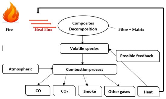 Thus, when exposed to fire, they undergo thermal decomposition process as a result of several sequence of chemical reactions [15,16,17,18,19]. Basically, this decomposition process shows that high-molecular weight polymer chains are broken down into lower-molecular weight volatiles that permeate into the flame zone (as revealed in Figure 3) [4,8,20].