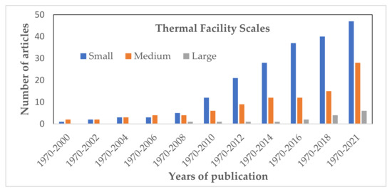 It can be observed from the trend of results (ranging from 1970 to 2021) that 47 articles (58%) were committed to the use of small-scale facilities, while 28 articles (35%) and 6 articles (7%) involved the utilisation of medium and large scales, respectively.