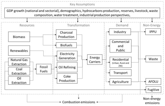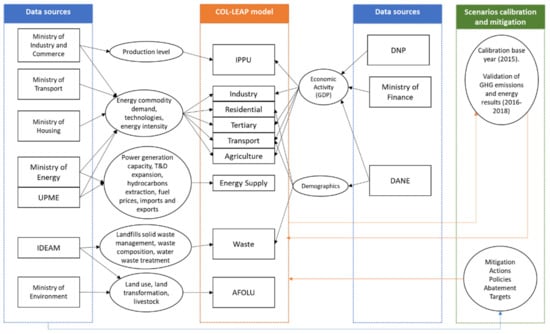 This paper describes the process of developing—in the Long Emissions Analysis Platform software (LEAP)—a Colombia-tailored model (COL-NDC) to formulate the baseline emission trajectory for Colombia’s 2020 INDC update and assess future energy needs, as part of a project jointly requested by the Colombian government and the World Bank. Previous LEAP models have been developed for Colombia focused on the energy sector [6,7,8]. Other studies have used LEAP to analyze the GHG emissions reductions in Colombia and other Latin American countries (i.e., Mexico, Chile, Panama) [9,10,11,12,13]. Conversely to these models, the COL-NDC model includes all energy and non-energy sectors, which provides a holistic approach to GHG emissions accounting and exploration of decarbonization scenarios. The model covers the emissions from all categories defined by the Intergovernmental Group of Experts on Change Climate (IPCC), which are Energy, Industrial Processes (IPPU), AFOLU, and Waste. A unique model is capable of handling interactions among mitigation measures adopted by different sectors (e.g., fugitive emissions reduction due to less extracting activities, which are a result of mitigation actions in-demand sectors). LEAP was chosen as it facilitates the construction of several scenarios using an accounting simulation approach, it can include non-energy sectors, it allows each sector to be modeled with a different approach according to the available data (e.g., top-down, bottom-up), and it does not require a technology-rich database. However, the tool also has some limitations, such as capturing the total system cost, endogenously defining the marginal price of products (e.g., steel price, space heating), and choosing the most cost-optimal scenario based on techno-economic parameters.