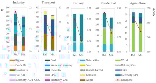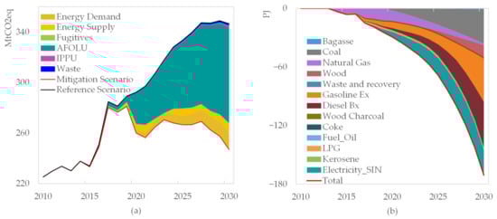The mitigation scenario is the aggregation of individual mitigation actions. Since the potential of some measures is limited, these are grouped by affinity (e.g., energy efficiency measures, waste treatment measures) and pertinence (i.e., NAMA coffee and NAMA Panela energy efficiency). The mitigation scenario covers 44 measures which are listed in Table 11 (for more information see Appendix A, Table A3, Table A4, Table A5 and Table A6), proposed by each responsible ministry in the Colombian government as the result of previous and ongoing projects [52,53]. In LEAP, each mitigation action is individually modeled to assess its actual mitigation potential and limitations, as well as possible intersectoral synergies. When LEAP combines the individual mitigation actions into one aggregated scenario, such scenario inherits the parameters of the mitigation portfolio. Thus, in the case of mutual excluding mitigation actions (e.g., coal replacement with natural gas, and complete electrification of end-use), LEAP uses the expression of the last mitigation action in the inheritance order, therefore, the order must reflect the hierarchy, or priority, of the measures.
