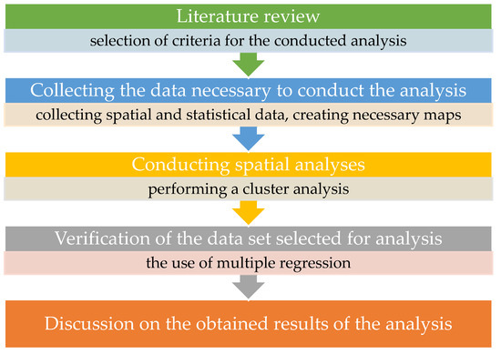 The research was preceded by a literature review in sustainable development, cluster analysis, and multiple regression. Subsequently spatial and statistical data were collected. Then, a database was built that was used to conduct spatial analyses in the spatial information system. Clusters were built, and the results were analyzed. Subsequently, multiple regression was used to verify the set of data accepted for analysis. The methodology used in the research is presented in the diagram below (Figure 1).