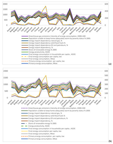 The indicators of the achievement of SDG7 are presented in the Table 1 and Figure 2. Figure a presents the values of indicators in 2000, while b is the year 2019.