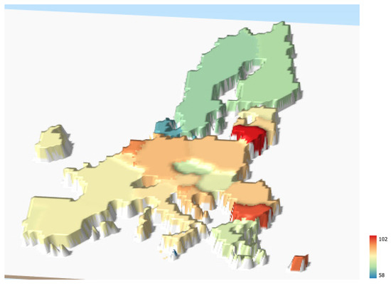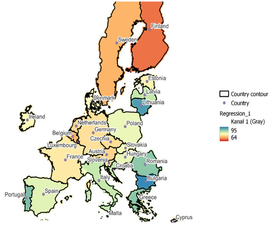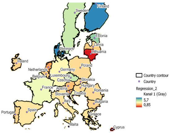 Multiple regression models were used to create raster maps of the explained variables presented in the Figure 10 and Figure 11. They present the value of the dependent variable predicted based on the values of the explanatory variables that were used to carry out the analysis. Multiple regression also makes it possible to build forecasts of dependent variables in a selected time horizon (period for which the forecast is determined). After introducing only statistically significant variables into the model, the obtained values of explanatory variables were calculated on the basis of multiple regression parameters. It was noticed that the results of the forecast correspond to the empirical values. In the case of greenhouse gas emission, the highest emission level was recorded in Lithuania, and the lowest in Finland. In the case of primary energy consumption per capita, the highest energy consumption was recorded in Finland, and the lowest in Lithuania. The results of the empirical and forecast values are presented in Table 6. The low values of the model errors and the clear compliance of the forecasted values with the empirical values indicate the need to verify the validity of the constructed set of indicators.