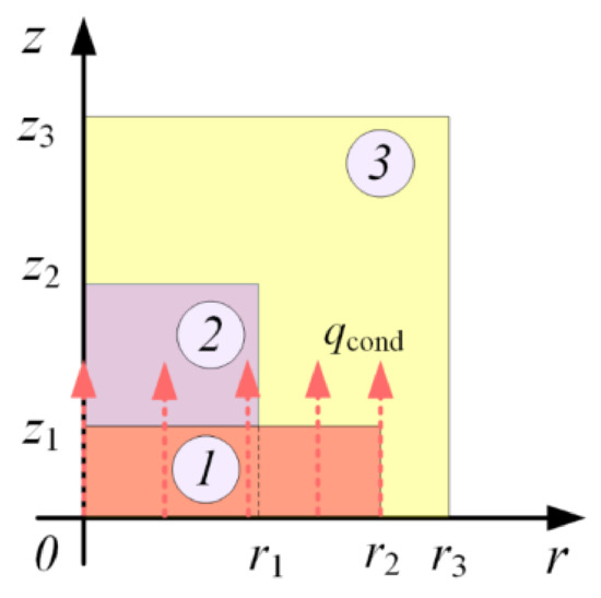 For the steam–gas mixture (0 < r < r1, z2 < z < zL, r1 < r < rL, z1 < z < zL, r2 < r < rL, 0 < z < z1):