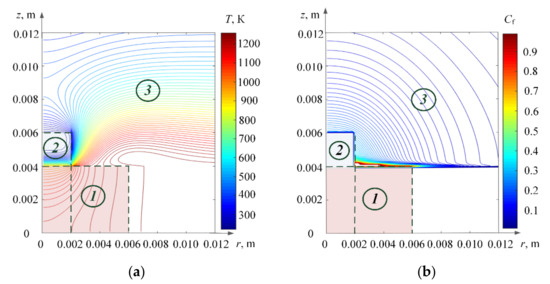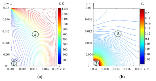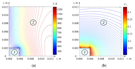 (a) Temperature field under convective heating; (b) Field of relative concentrations of fuel vapors under convective heating; 1—gel fuel sample, 2—steam–gas mixture. Conditions: T = 1273 K, α = 50 W/(m2∙K).