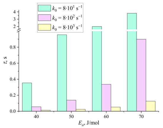 Theoretical dependency of the ignition delay time τ on Ea when k0 is varied under the conditions of conductive heating (T = 1173 K).