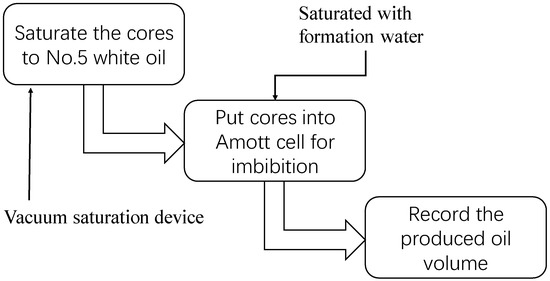 There are three main steps for experiments. First, cores are saturated to No. 5 white oil by vacuum saturation device. Then, the saturated cores are put into an Amott cell that contains the simulated formation water for spontaneous imbibition processes. During the imbibition, the volume of the produced oil is recorded with time. The schematic of the experiments is shown in Figure 1.