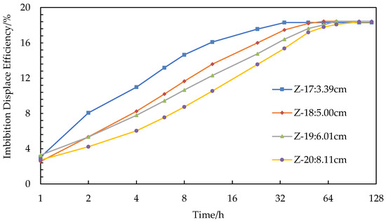 Figure 4 depicts the imbibition results for testing the effects of the RQI. There is a big error in evaluating the physical properties of ultra-low-permeability reservoirs with a single parameter of permeability or porosity, so the reservoir RQI () is used to characterize the impact of reservoir physical properties on the imbibition displacement efficiency [10,16,17,18]. The imbibition results in Table 2 show that a higher RQI leads to a greater final imbibition displacement efficiency and higher imbibition speed at the early stage of imbibition. Figure 4 shows a good positive correlation between the RQI and the final oil displacement efficiency.