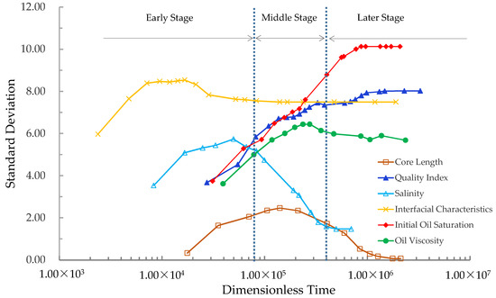 Figure 9 shows the discreteness of the controlling factors with the dimensionless time. According to the strength of controlling factors, the imbibition processes are divided into three stages: the early stage, middle stage, and later stage. It can be seen from the figure that the standard deviations of the controlling factors are inconsistent at different imbibition stages. In the early stage, the controlling factors affecting the efficiency of imbibition and displacement are sorted as the interfacial characteristics > salinity > initial oil saturation/RQI > oil viscosity > core length. For the middle stage, controlling factors are sorted as the interfacial characteristics > initial oil saturation/RQI > oil viscosity > salinity > core length. For the late stage, the important sequences of controlling factors are as follows: the initial oil saturation > RQI > interfacial characteristics > oil viscosity > salinity > core length.