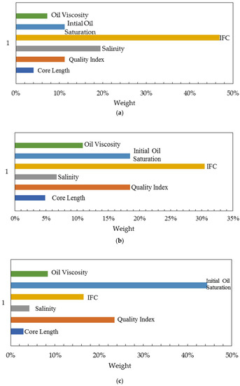 Therefore, the random consistency ratios can be calculated for the three imbibition stages. The results are: CR1 = 0.0237, CR2 = 0.0133, and CR1 = 0.0443. Since all CR values are less than 0.1, the three judgment matrices all satisfy the consistency criteria. According to the corresponding feature vectors, the weights of the importance for each controlling factor on the imbibition recovery are shown in Figure 10 according to the imbibition stages.