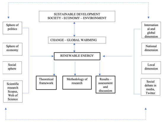 Issues related to renewable energy in the context of sustainable development and climate change are complex and multidimensional. It is a truly global problem, affecting everybody everywhere, presently and in the future. It is not placed within political, social, or economic boundaries [6,7]. It has an international, national, and local dimension in the context of political declarations and decisions, legal regulations, economic policies (including climate, energy, and environmental policies) [8,9,10,11,12,13], business, technical, technological and social activities, educational standards, and the social awareness of sustainability and climate change, consumer lifestyles, households, and consumption related to demand for energy and the potential, sources, and structure of its supply [14,15,16,17,18,19,20,21,22,23,24]. These issues are undertaken in research studies representing various areas and disciplines of social sciences, and widely discussed in the media including social media (Figure 1). This is an important context justifying the title problem of the paper.