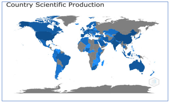 Country specific production of articles indexed in Scopus and Web of Science (keyword “renewable energy” 2019–2021). The blue illustrates the number of publications in selected countries—the darker the colour, the more publications in the analysed period.