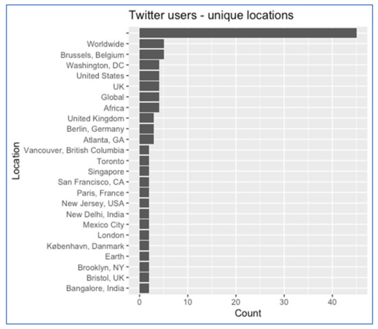 Their locations were checked in the second phase (Figure 5). It is an important element of the analysis of tweets. It should be noted that locations are provided by users in an arbitrary way—not all Twitter users turn on the location function and provide such information along with posts. In total, the analysed users provided more than 399 different locations. Most tweeters do not disclose their locations, which is widely discussed in social media ([64,109,110]). In addition, it should be noted that scientific debates are dominated by China and the USA, and in the case of Twitter such activities carried out by Chinese internet users are not recorded or simply not disclosed.