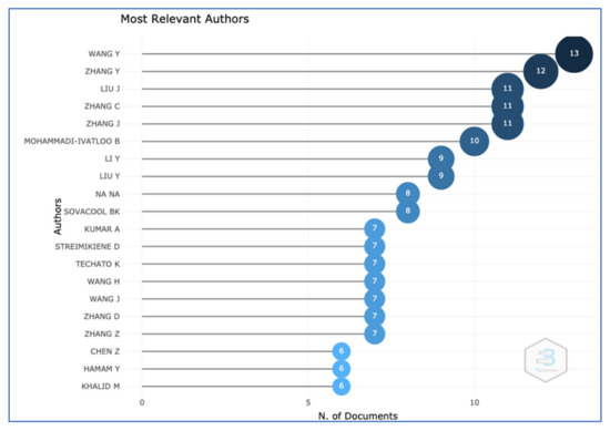 A group of 20 authors published 6–13 articles on RES. Six authors published more than 10 texts. In the case of Scopus and Web of Science, in the analysed period (2019–2021), the following researches authored or co-authored the most considerable quantity of documents (above nine, the number is given in parentheses): Wang Y. (13), Zhang Y. (12), Liu J. (11), Zhang C. (11), Zhang J. (11), and Mohammadi-Ivatloo B. (10). The list of authors who had six or more publications in selected years is presented in Figure 5. As already mentioned, out of 2443 articles the largest numbers came from China (517 publications in combined Scopus and WoS bases), the USA (474 publications), India (361), UK (241), Germany (235), and Spain (232). Additionally, the analysis focused on the most relevant affiliations. The results indicated that scientific centres most frequently affiliating research on “renewable energy” included (above 20, the number is given in parentheses) Denmark’s Aalborg University (33 articles), China’s North China Electric Power University (32), Tsinghua University (21), and the University of California in the USA (21).