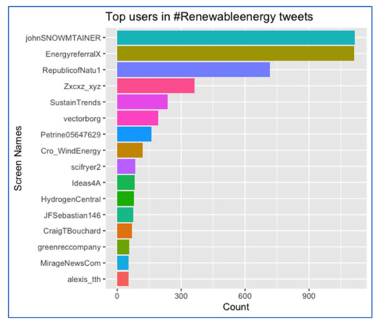 The most productive nicknames were acquired in the studied collection of tweets. Figure 6 presents top users in #renewableneergy among 1598 analysed users. More than 600 #renewableenergy hashtags were added by the following tweeters: johnSNOWMTAINER (present on Twitter since June 2018, in July 2021: 2671 followers), EnergyrefferalX (present on Twitter since June 2019, in July 2021: 1795 followers), and RepublicofNatu1 (present on Twitter since April 2019, 491 followers). All the above users focus on environmental-related issues. Other top users are presented in Figure 7.