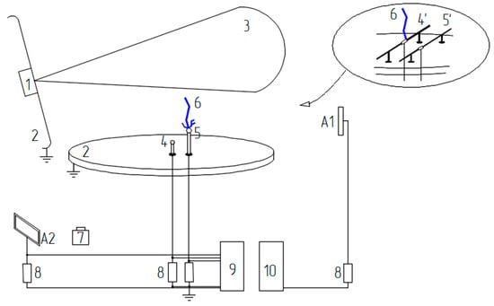 First scheme of experimental and measurement setup: 1—charged aerosol generator, 2—grounded electrostatic screens, 3—artificial thunderstorm cell, 4, 5—rod electrodes, 4′, 5′—elongated electrodes, 6—upward discharge phenomena, 7—digital camera Panasonic DMC-50, 8—shunts, 9, 10—digital memory oscilloscopes Tektronix TDS 3054B и Tektronix DPO 7254, A1, A2—flat antennas.