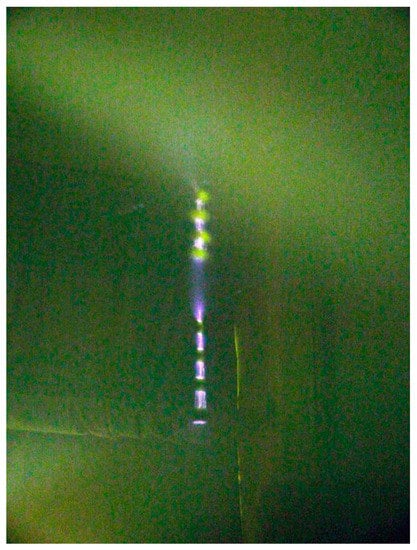 Figure 2, Figure 3 and Figure 4 demonstrate photos of the different discharge phenomena, forming either between cells of different polarity or between cells and grounded objects. In recent years, a similar complex based on a generator of charged aerosol has been used in Istra (Moscow region) (Rakov V.A., Syssoev V.S., Kostinskiy A.Y. et al. [29,30,31,32,33,34]). This generator was also developed at the Department of Electrophysics and High Voltage Technique (National Research University “Moscow Power Engineering Institute”).