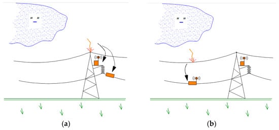 Figure 5. Variants of formation of discharge phenomena affecting power lines’ digital monitoring systems: (a) streamer corona/upward leader discharge forms on a transmission tower, (b) streamer corona/upward leader discharge forms on a middle segment of a lightning protection wire. - -