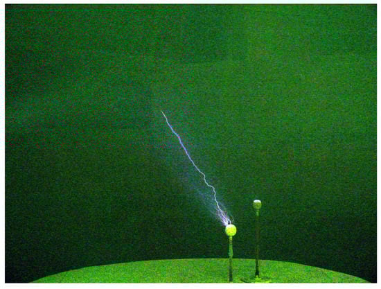 Therefore, a slow increase in the electric field’s intensity is observed in the significant area of the space between an artificial thunderstorm cell and ground. Due to the inertial character of the charged cloud formation and existence of negative feedback between the cell and occurring discharge phenomena, it can thus be expected that all discharge processes in the space between the cell and grounded model object will occur and develop under minimal required conditions practically without overvoltage. In this case, the character of distribution and value of electric field’s intensity between an artificial thunderstorm cell and the grounded plane are comparable to characteristics of the field under a real thundercloud. Such a field is characteristic of the conditions when a thundercloud (or a downward lightning leader beginning to develop from the cloud) affects all above-ground objects [28]. By changing the generator’s outlet current, it is possible to emulate the development of all types of sparks characteristic for a thunderstorm, including leader stage and main discharge.
