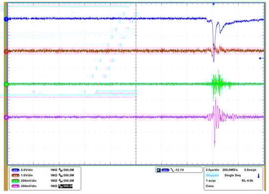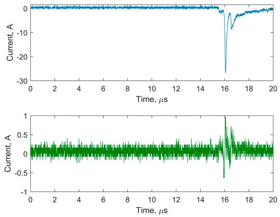 Figure 8 represents a characteristic oscillograph chart for the current of streamer flash and incomplete upward leader discharge and signals induced on the nearby grounded element and antennas. The following parameters were registered for the current signal: current amplitude, maximal velocity of current build-up, impulse charge, and total impulse length.