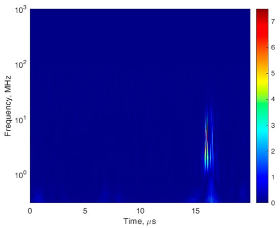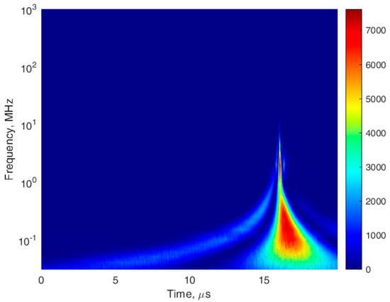 Spectral characteristics of the induced signal were determined using software created specifically for this purpose. It was based on the Mexican hat wavelet analysis [36,37,38]. Upper level of the characteristic frequency, maximal intensity, and frequency of the maximal intensity in the wavelet spectrum have been determined. Characteristic wavelet spectrums for the currents and induced signal presented in Figure 9 are shown in Figure 10 and Figure 11, correspondingly. These signals correlate to the signals from channels 1 and 2, represented in Figure 8.
