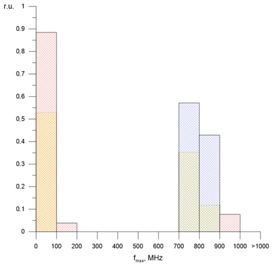 Histogram of diapasons of characteristic maximal frequencies in wavelet specter of the signals induced by close upward discharges on model elements of the rod and elongated types. Group 1—red; Group 2—blue; Group 3—yellow.
