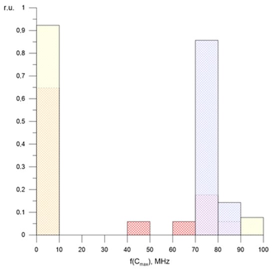 Histogram of f(Cmax) (frequency diapason corresponding to the maximum intensity of Cmax) in the wavelet specter of signals induced by the nearby located upward discharges on model elements of the rod and elongated types. Group 1—red; Group 2—blue; Group 3—yellow.
