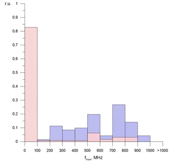 Maximum frequencies (fmax) in the wavelet specter of induced signals: 11–170 MHz; 900–1000 MHz. Frequencies corresponding to the maximal intensity of the wavelet specter (f(Cmax)) of induced signals: 0.1–8 MHz; 90–100 MHz.