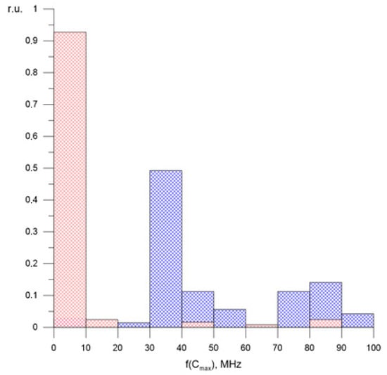 Histogram of diapasons of f(Cmax) in wavelet specter of signals induced on the flat antennas by a nearby discharge: antenna A1 (in blue); antenna A2 (in red).