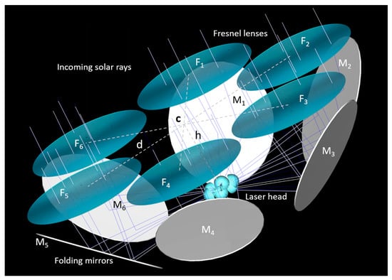 The proposed side-pumping solar laser approach (Figure 1) was composed of six circular Fresnel lenses (F1–F6) for collection and concentration of the incoming solar radiation, aligned with six plane folding mirrors (M1–M6), which redirected the concentrated solar radiation from the Fresnel lenses onto the laser head. Each Fresnel lens was centered at a distance d = 950 mm from their common optical center point C, which was placed at a height h = 551 mm above the center of the laser head, as indicated in Figure 1. The plane folding mirrors had an inclination angle of 45° in relation to their common optical axis and were located below their respective Fresnel lenses. In ZEMAX® non-sequential analysis, the radius parameter defines the radius of curvature of the Fresnel lens. For this system, an optimum radius of curvature of 700 mm was used, corresponding to a focal length of approximately 1.5 m. The Fresnel lenses were made of polymethyl methacrylate, which has high transmission efficiency for both visible and near-infrared wavelengths between 350 and 900 nm. Each one of the 3 mm thick Fresnel lenses had a radius of 461 mm, summing a total collection area of 4 m2. For the whole solar spectrum, an averaged transmission efficiency of 84% was numerically attained for the Fresnel lenses. For 950 W/m2 terrestrial solar irradiance and 95% reflectivity plane folding mirrors, a total of 3032 W solar power was assumed to reach the laser head.